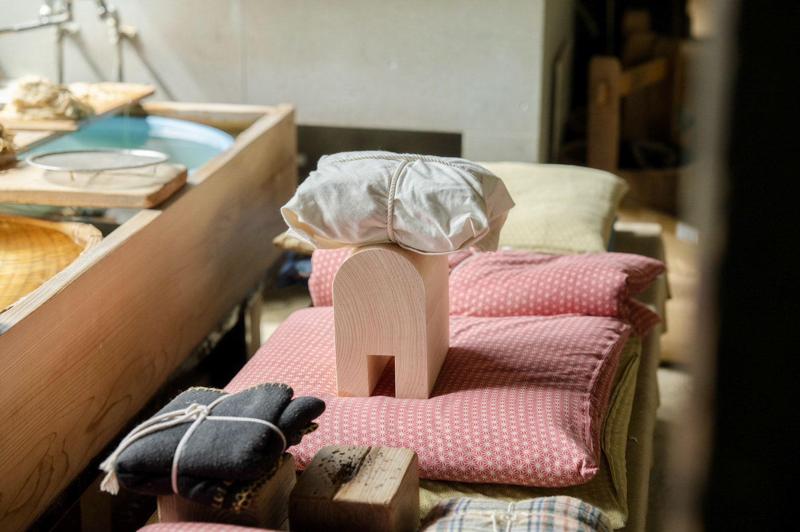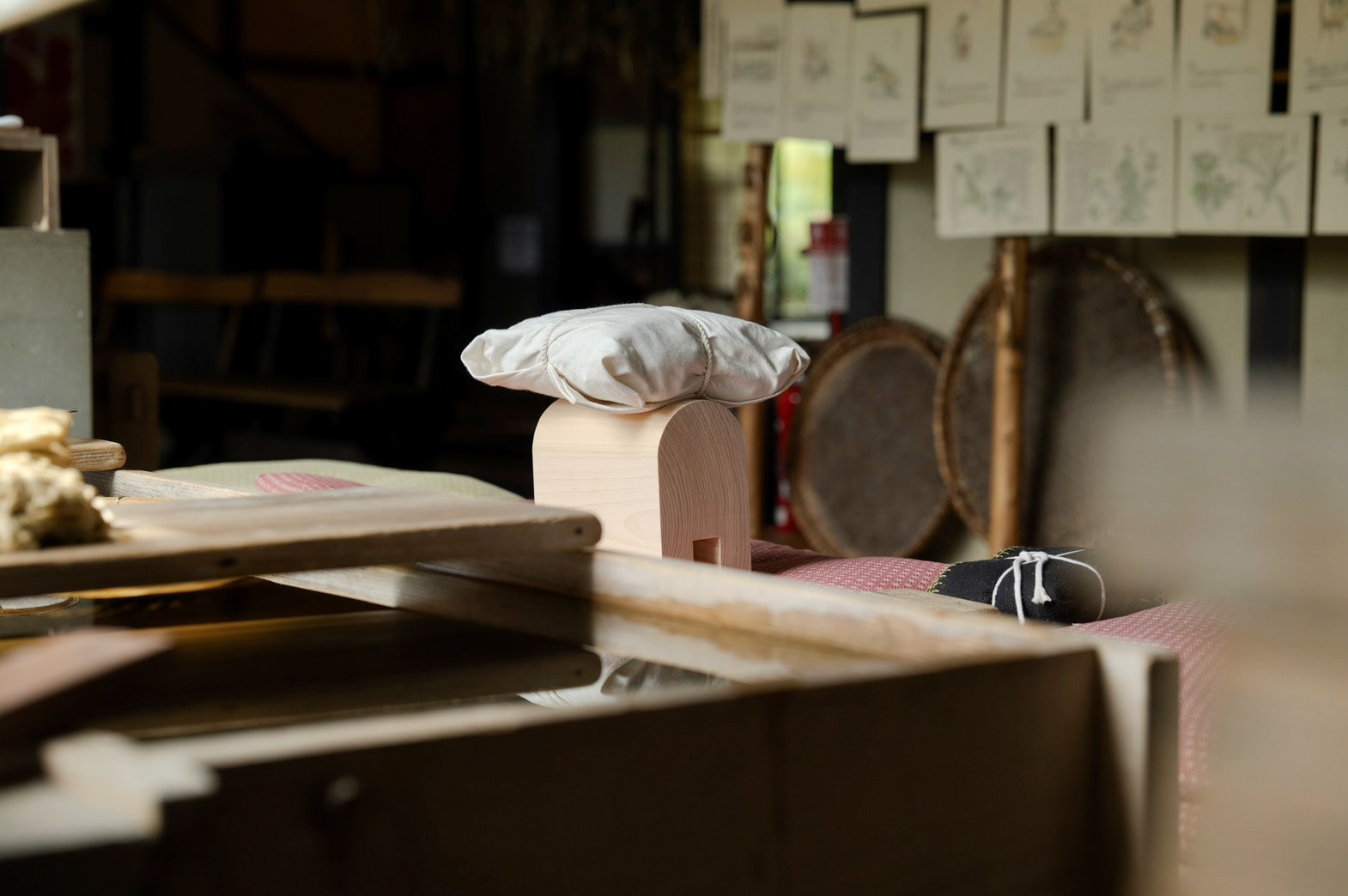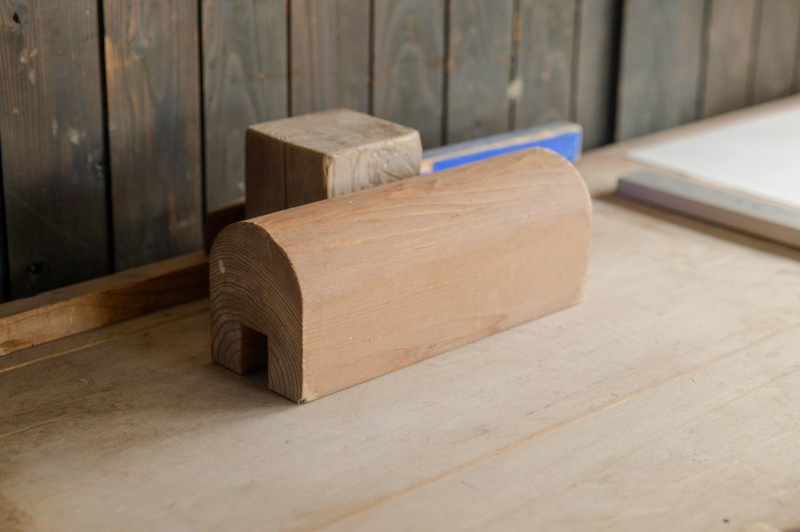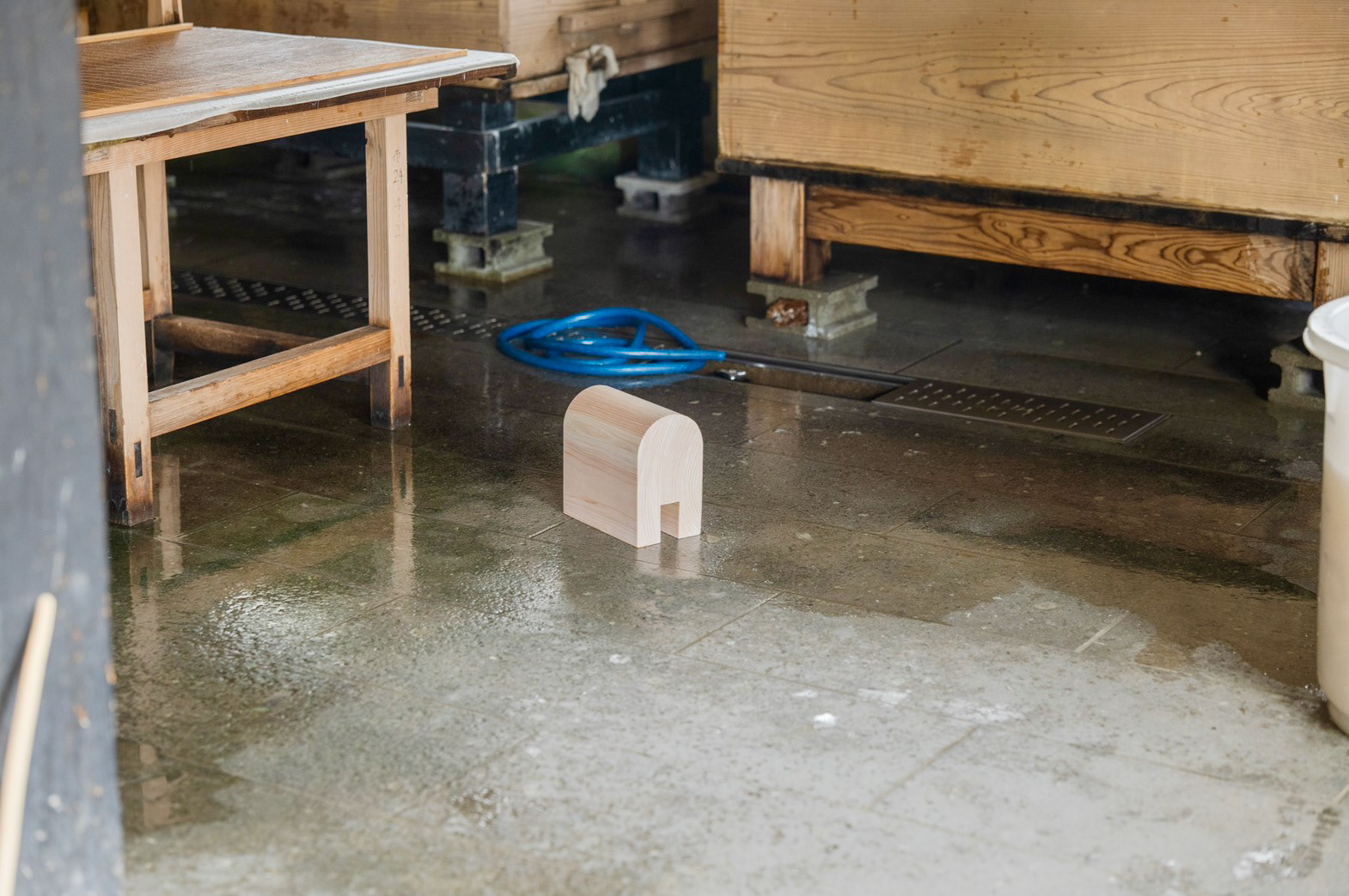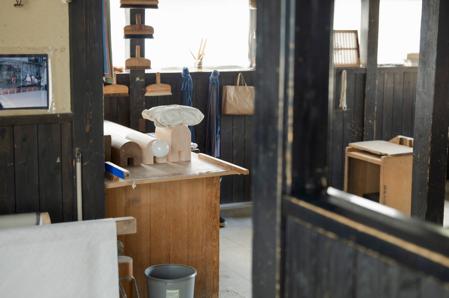 枕木(別名 枕)がモチーフ 座って紙を漉く時に、前屈みになって、体勢がとても辛いから、 漉き舟に引っ掛けて、クッションの代わりにしていた でも、今では座って漉くことがないために、工房の端っこで使われていない 形状がとても良かったので、別の用途を持たせて、残せないかと思った 二つとも漉き舟に実物通りに使うことができる The motif is a sleeper (also known as a pillow). When making paper while sitting, you have to bend forward, which is very uncomfortable, so they were hung on the papermaking boat as a cushion. However, since people no longer make paper while sitting, they sit unused in the corner of the workshop.Their shape was so beautiful that I thought it would be nice to give them another use and keep them. Both can be used for the papermaking boat just like the real thing.