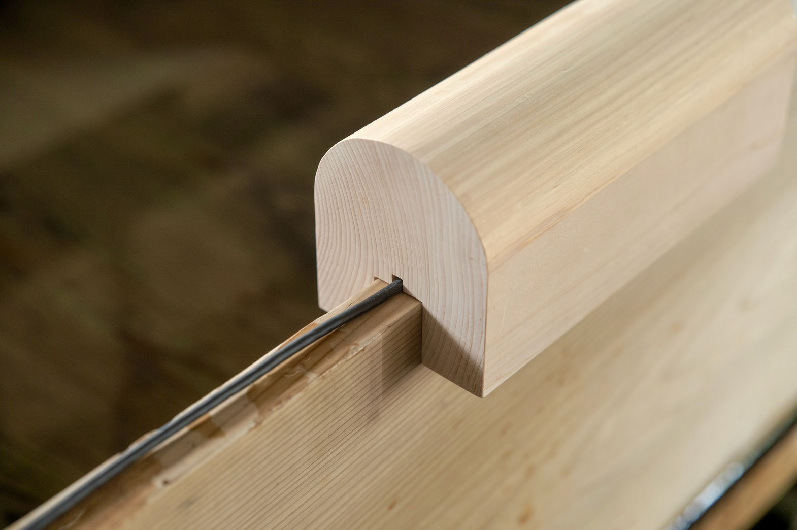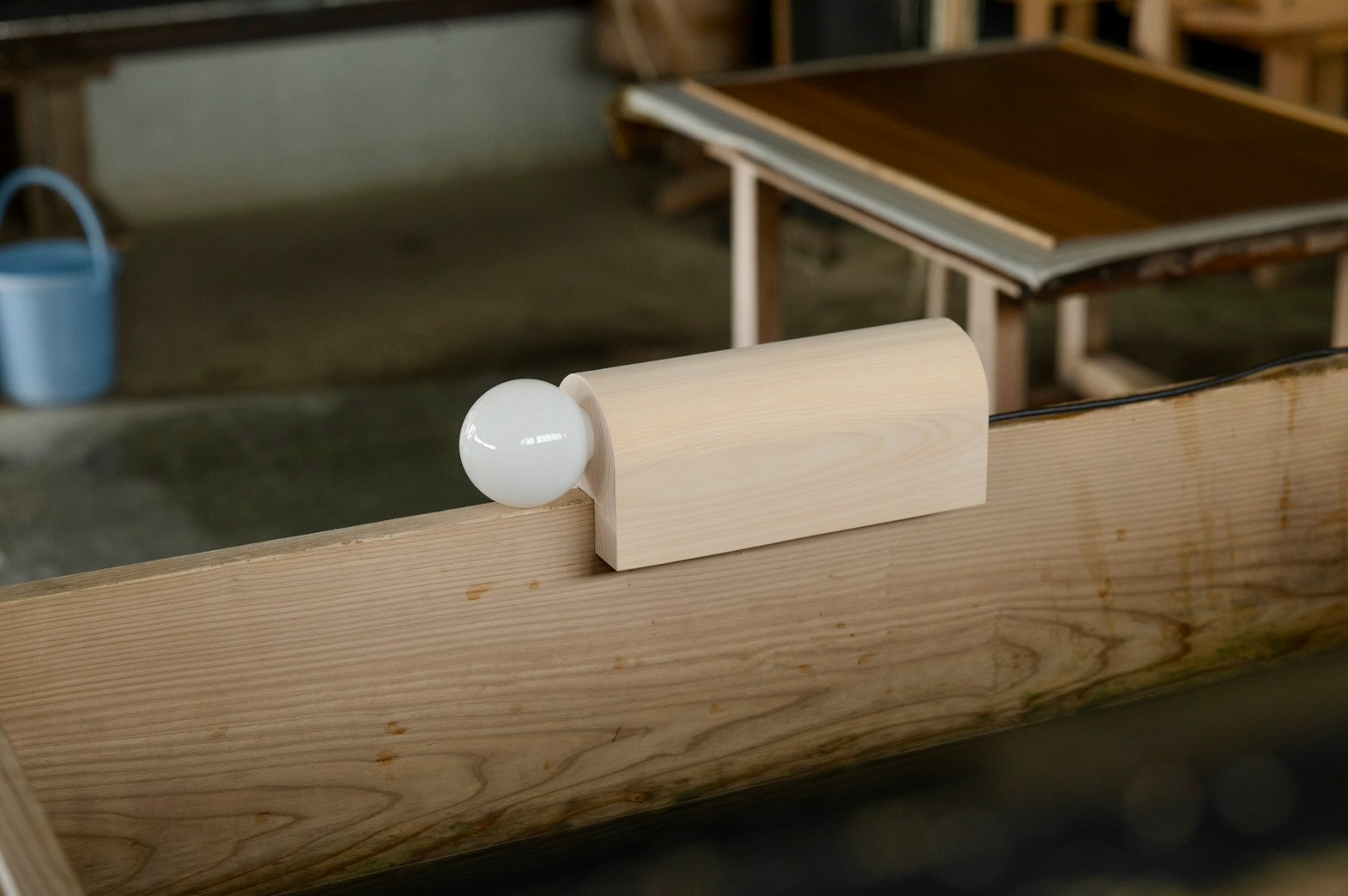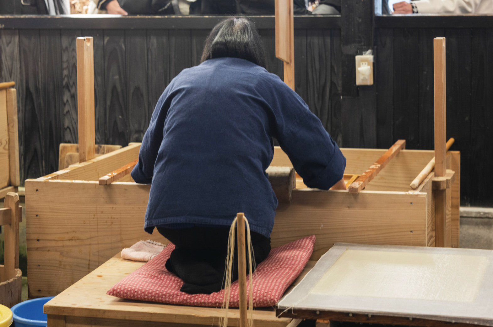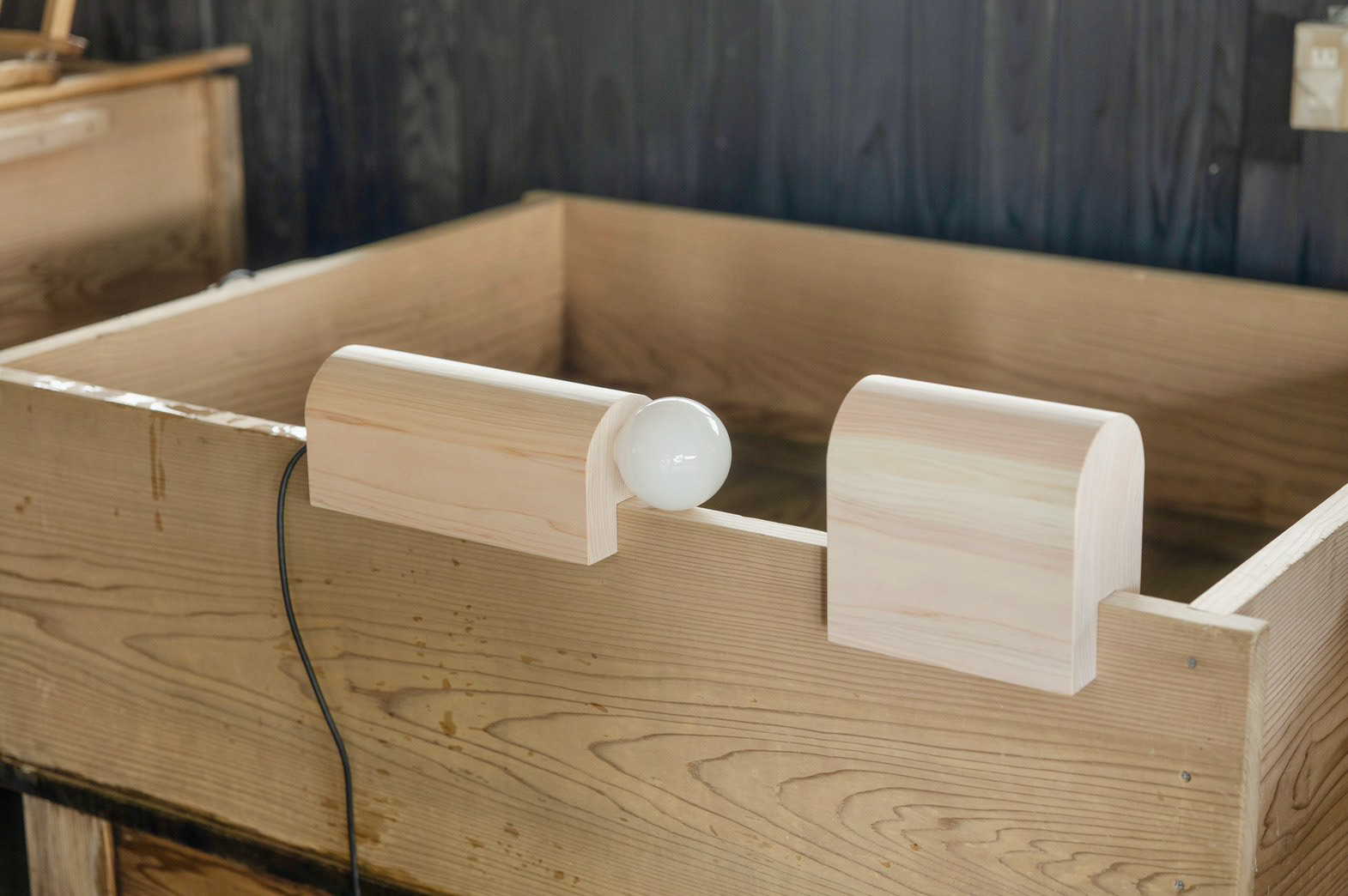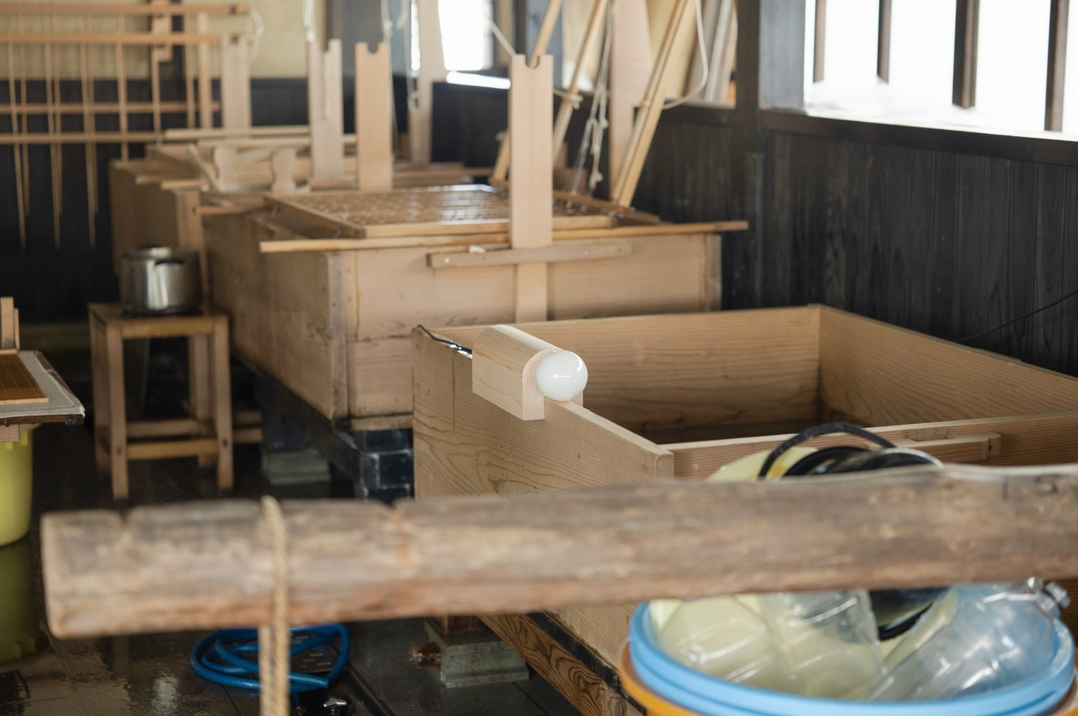 枕木(別名 枕)がモチーフ 座って紙を漉く時に、前屈みになって、体勢がとても辛いから、 漉き舟に引っ掛けて、クッションの代わりにしていた でも、今では座って漉くことがないために、工房の端っこで使われていない 形状がとても良かったので、別の用途を持たせて、残せないかと思った 二つとも漉き舟に実物通りに使うことができる The motif is a sleeper (also known as a pillow). When making paper while sitting, you have to bend forward, which is very uncomfortable, so they were hung on the papermaking boat as a cushion. However, since people no longer make paper while sitting, they sit unused in the corner of the workshop.Their shape was so beautiful that I thought it would be nice to give them another use and keep them. Both can be used for the papermaking boat just like the real thing.