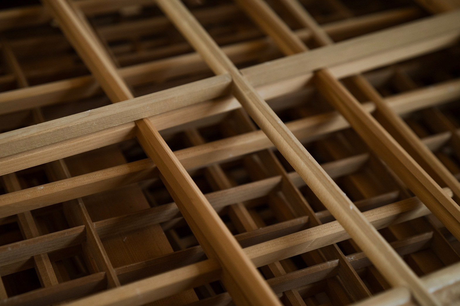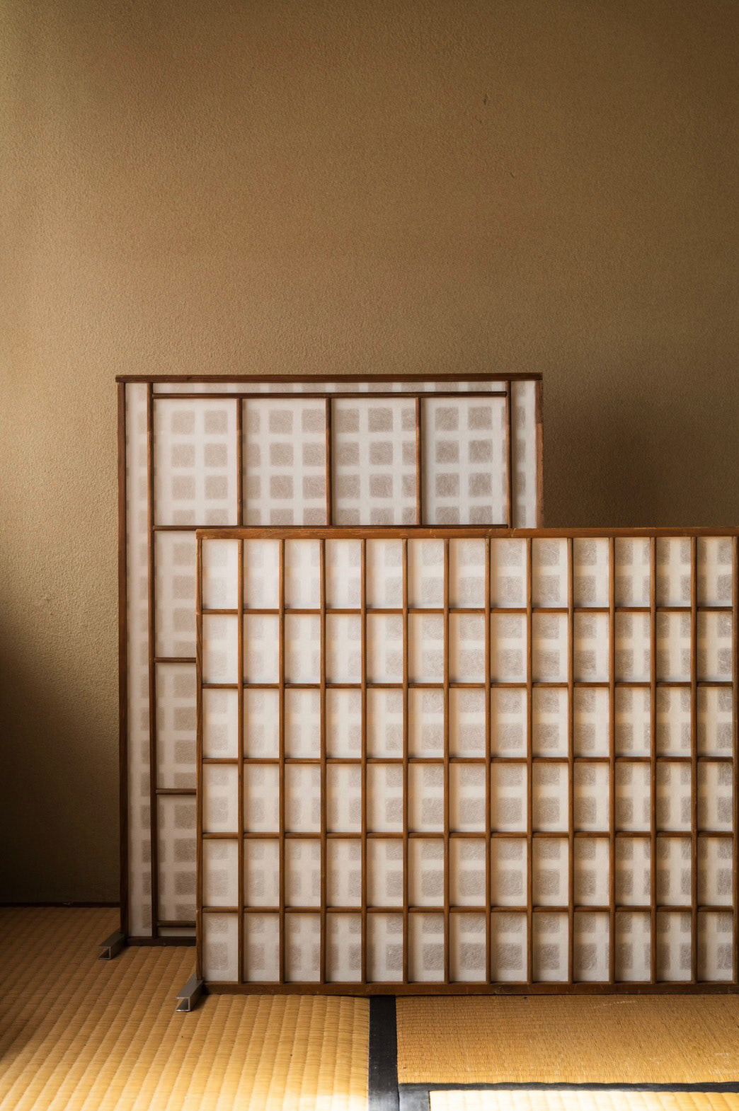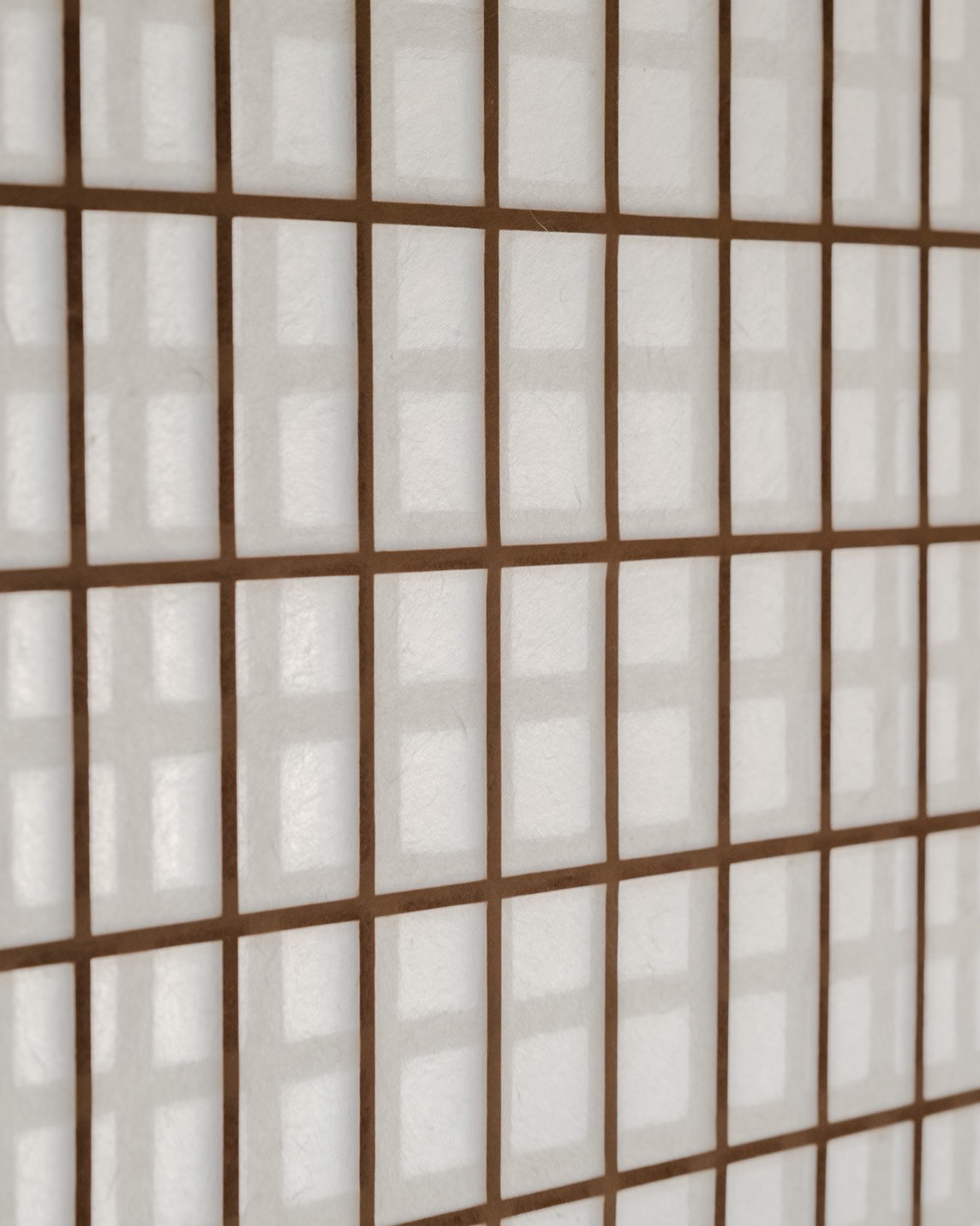 今は使っていない型枠が大量にある 時代とともに、型が変わり使えなくなったもの ただ、紙漉き以外では使えると思った 丁寧に作られた枠なので、障子のようなパーテーションにすることで、日常使いができて、障子みたいに剥がしたら、また、紙漉きに使える 紙は長田さんの透かし紙 この四角の組み合わせが、複雑な印影になっておもしろいかなって We have a large number of unused molds lying around. They've become obsolete as molds changed with the times. But I thought they could be useful for something other than papermaking. Since they're carefully crafted frames, turning them into shoji-like partitions would make them usable in daily life. And just like shoji, if you peel them apart, they can be used for papermaking again. The paper is Osada-san's watermark paper. I thought the combination of these squares might create interesting, complex patterns. 上桁 : 信洋舎製紙所 和紙 : 長田製紙所