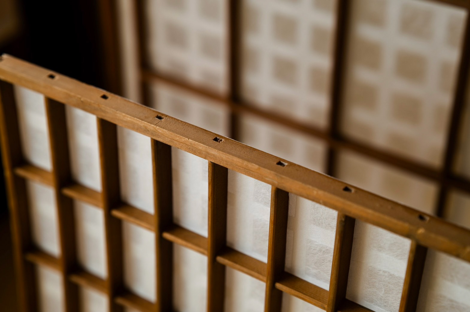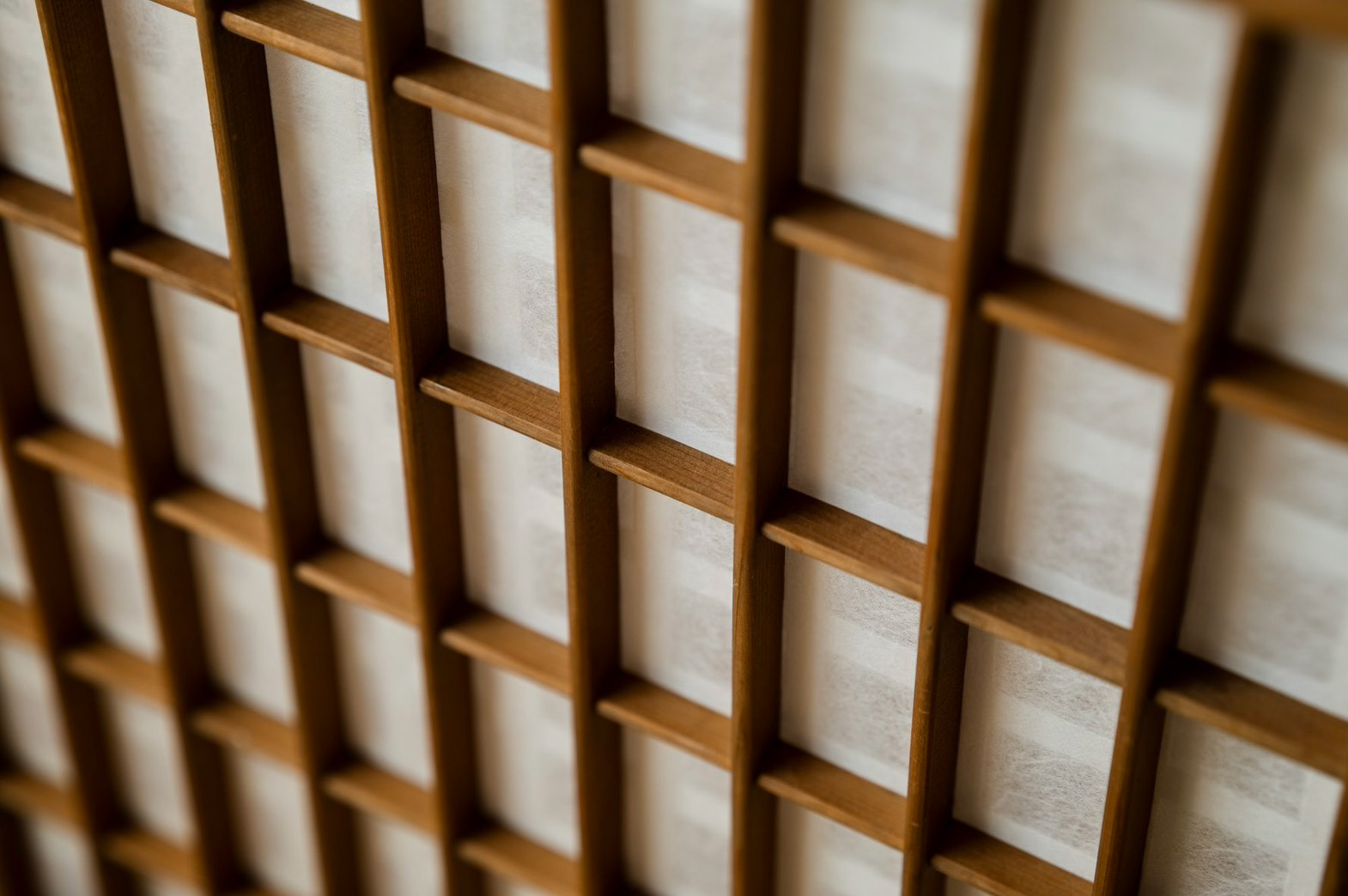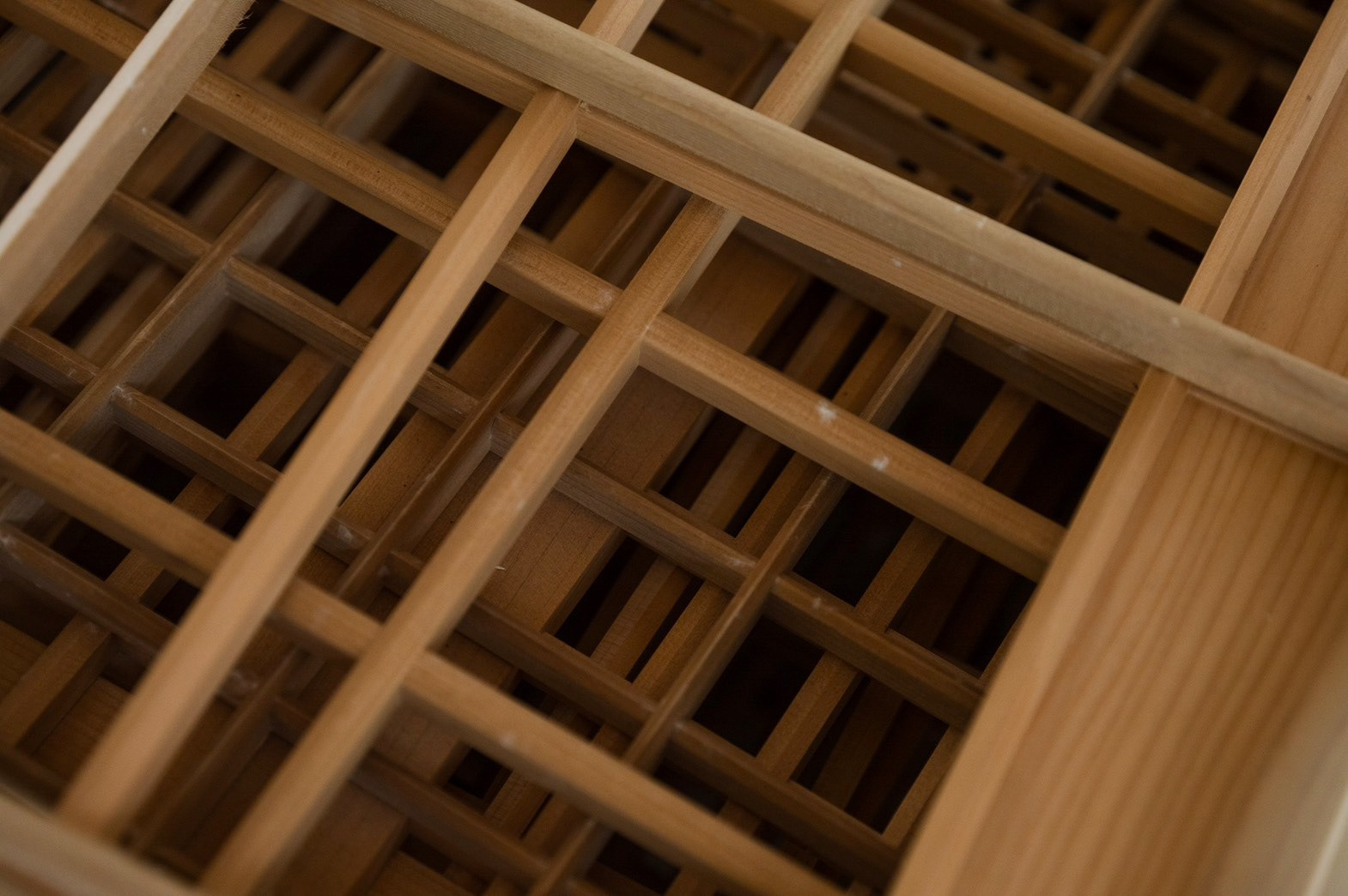 今は使っていない型枠が大量にある 時代とともに、型が変わり使えなくなったもの ただ、紙漉き以外では使えると思った 丁寧に作られた枠なので、障子のようなパーテーションにすることで、日常使いができて、障子みたいに剥がしたら、また、紙漉きに使える 紙は長田さんの透かし紙 この四角の組み合わせが、複雑な印影になっておもしろいかなって We have a large number of unused molds lying around. They've become obsolete as molds changed with the times. But I thought they could be useful for something other than papermaking. Since they're carefully crafted frames, turning them into shoji-like partitions would make them usable in daily life. And just like shoji, if you peel them apart, they can be used for papermaking again. The paper is Osada-san's watermark paper. I thought the combination of these squares might create interesting, complex patterns. 上桁 : 信洋舎製紙所 和紙 : 長田製紙所