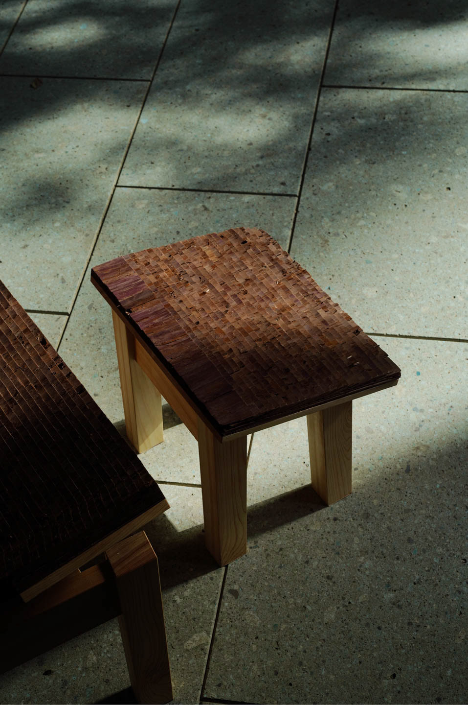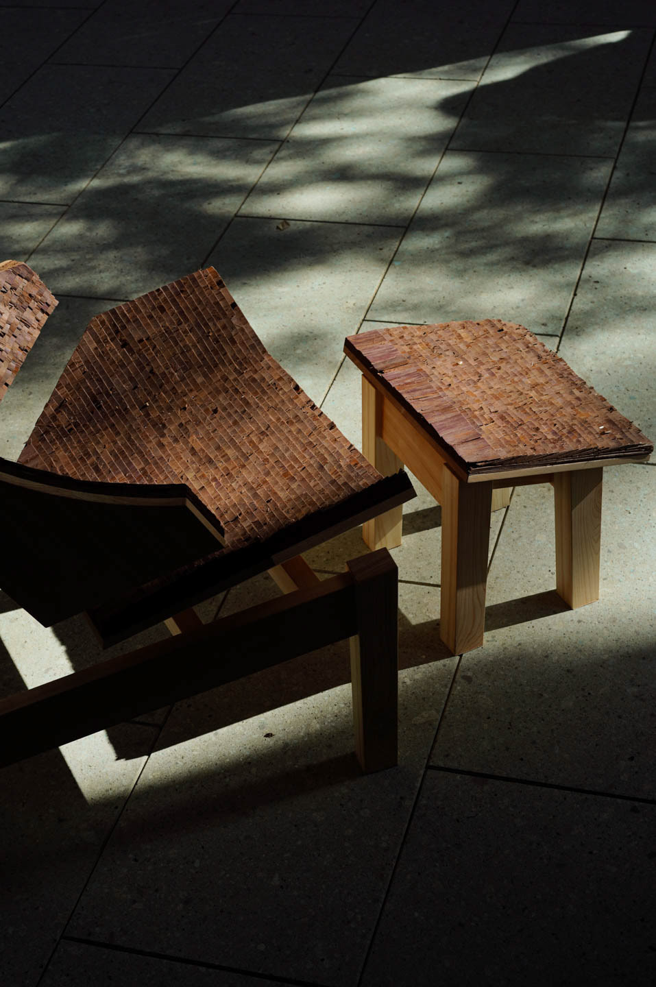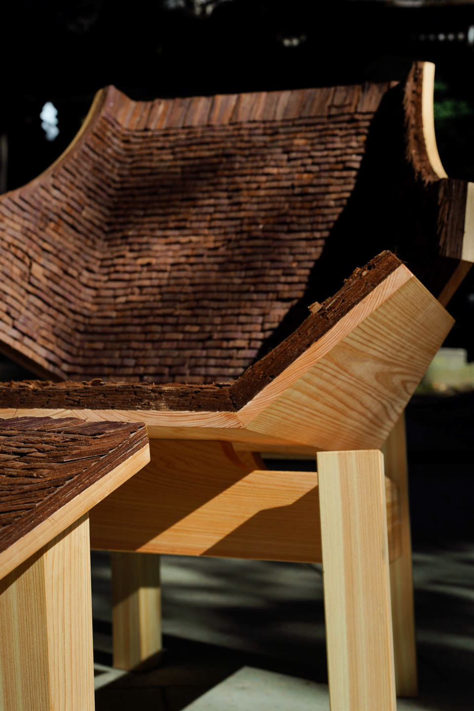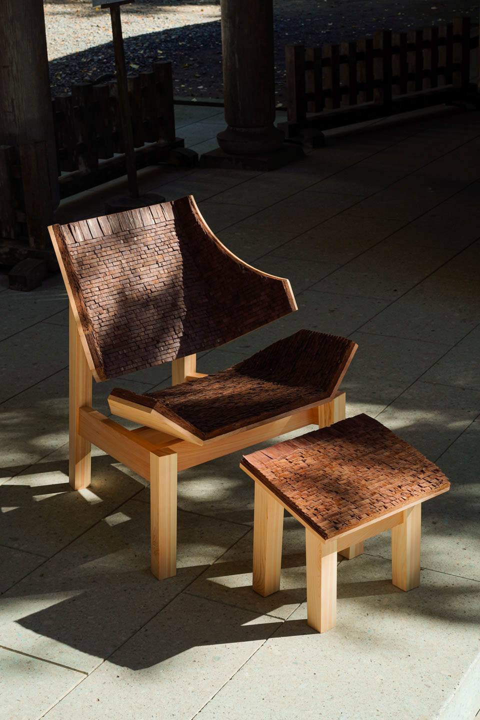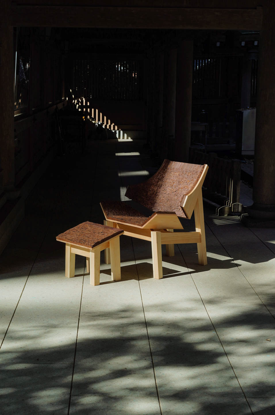 閃として幾度も制作に用いてきた越前和紙。その産地に立ち並ぶ製紙工房を抜けた先に、和紙の神を祀る大瀧神社が静かに佇んでいます。大瀧神社は、檜皮で葺かれた独特の多重構造の屋根を持ち、随所に施された美しい彫刻とともに、境内の圧倒的な存在感を放っています。本作は、この神社から着想を得てデザインしたラウンジチェアです。檜皮葺ならではの柔らかな曲線や香り、温かみのある触感を背や座面に生かし、柱や梁にあたるフレームで支えました。大瀧神社の屋根は、来年葺き替えを予定しています。今回の制作は、その予習とも言えるでしょう。私自身がその大工事に直接関わることはありませんが、産地に関わらせていただく者として、興味深く見守っていきたいと思います。 Echizen washi is a material we have repeatedly worked with as SEN. Beyond the row of papermaking workshops that define its place of origin, Ōtaki Shrine dedicated to the deity of washi stands quietly. The shrine is distinguished by its unique, multi-layered roof clad in hinoki bark, and together with the exquisite carvings found throughout, it commands an overwhelming presence within the grounds.This lounge chair was designed with inspiration drawn from that shrine. The gentle curves characteristic of hinoki-bark roofing, along with its scent and warm, tactile quality, are reflected in the backrest and seat, supported by a frame that corresponds to pillars and beams. The roof of Ōtaki Shrine is scheduled to be rethatched 2026. In that sense, this project can be seen as a kind of preparation or prelude. While I will not be directly involved in the major renovation, as someone who is engaged with this place of production, I look forward to observing the process with great interest. Design / Production : Kiichi Ueda Cypress bark : Terao Shouten Client : self work Period : November 2025 Photo : Rikuo Takata