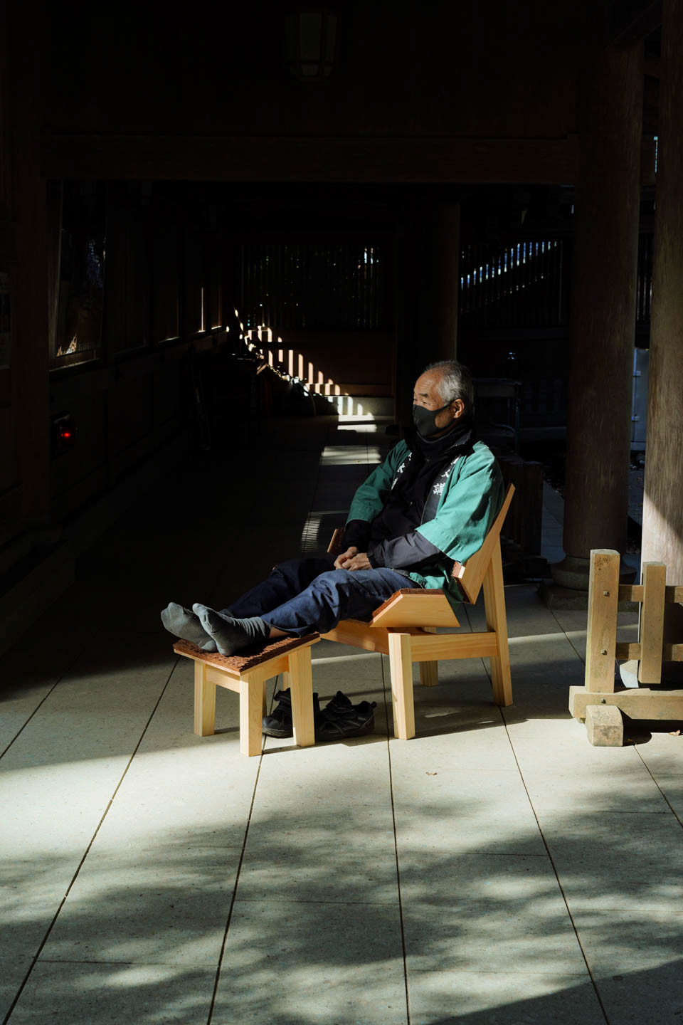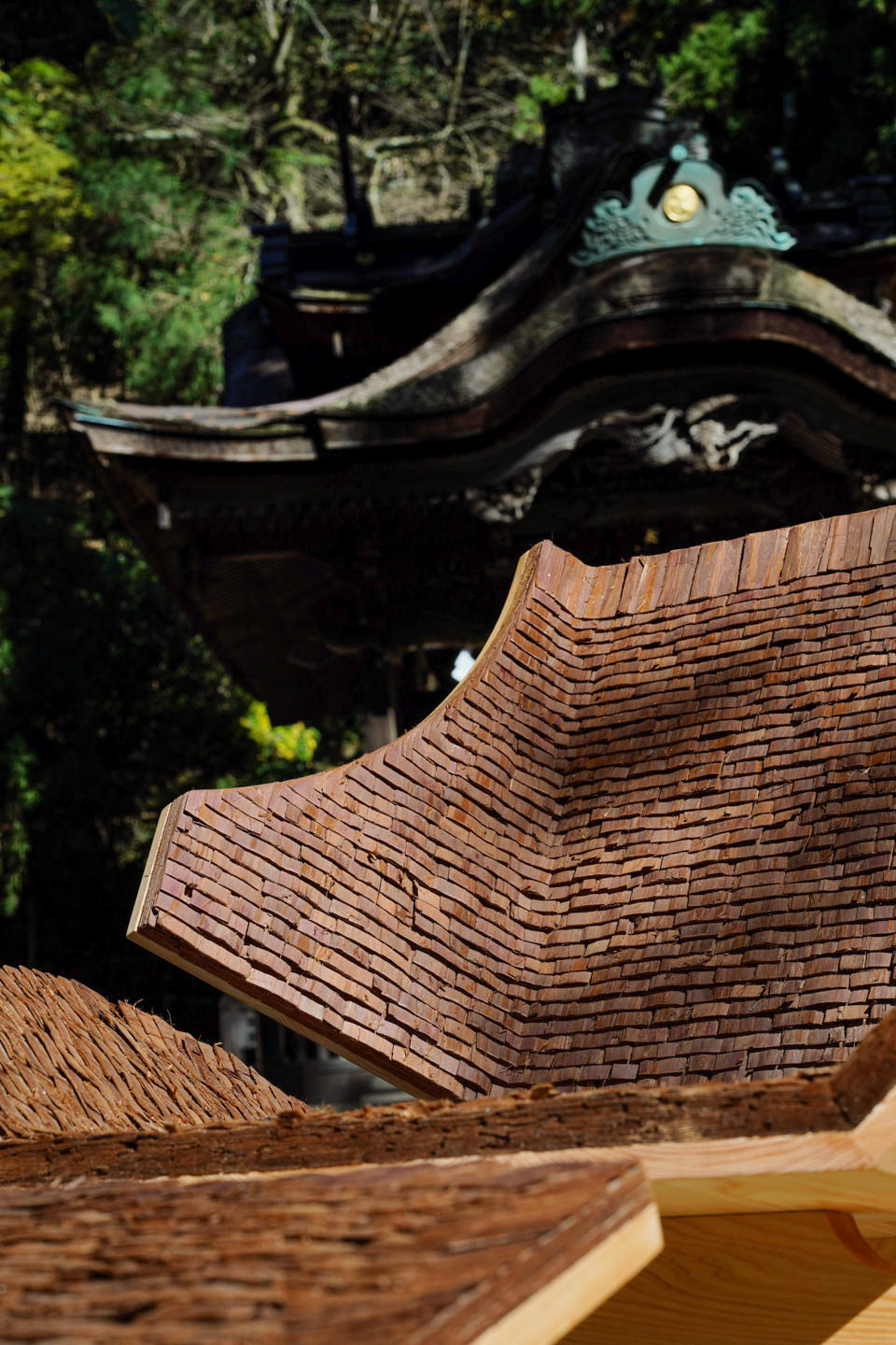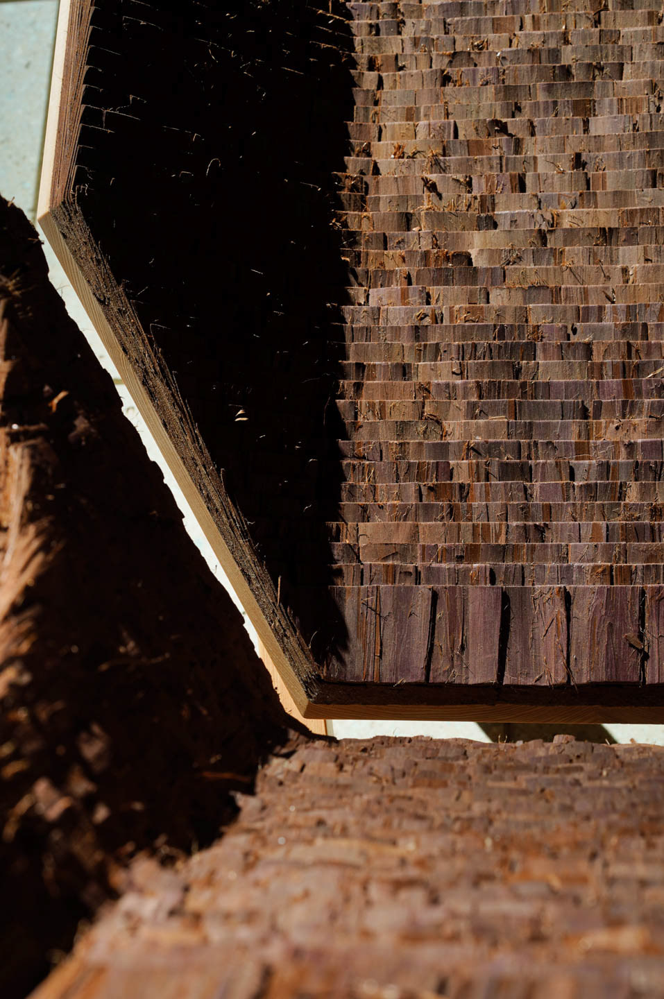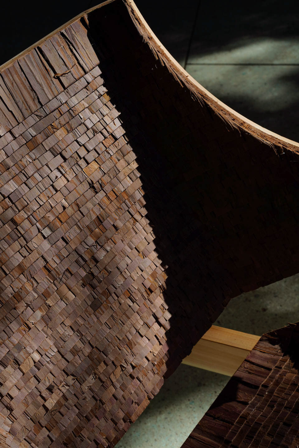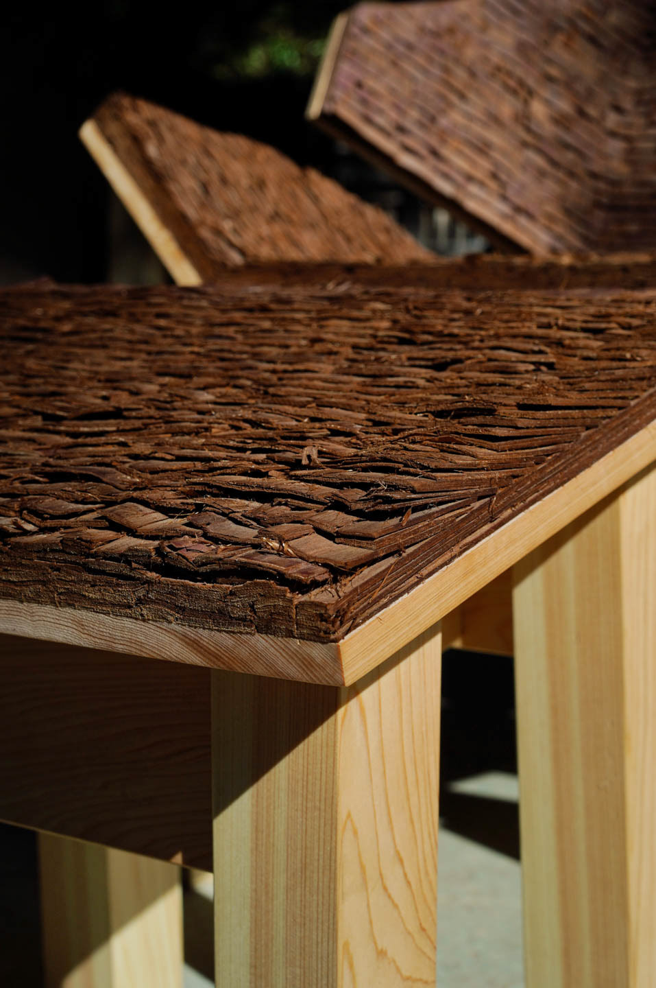 閃として幾度も制作に用いてきた越前和紙。その産地に立ち並ぶ製紙工房を抜けた先に、和紙の神を祀る大瀧神社が静かに佇んでいます。大瀧神社は、檜皮で葺かれた独特の多重構造の屋根を持ち、随所に施された美しい彫刻とともに、境内の圧倒的な存在感を放っています。本作は、この神社から着想を得てデザインしたラウンジチェアです。檜皮葺ならではの柔らかな曲線や香り、温かみのある触感を背や座面に生かし、柱や梁にあたるフレームで支えました。大瀧神社の屋根は、来年葺き替えを予定しています。今回の制作は、その予習とも言えるでしょう。私自身がその大工事に直接関わることはありませんが、産地に関わらせていただく者として、興味深く見守っていきたいと思います。 Echizen washi is a material we have repeatedly worked with as SEN. Beyond the row of papermaking workshops that define its place of origin, Ōtaki Shrine dedicated to the deity of washi stands quietly. The shrine is distinguished by its unique, multi-layered roof clad in hinoki bark, and together with the exquisite carvings found throughout, it commands an overwhelming presence within the grounds.This lounge chair was designed with inspiration drawn from that shrine. The gentle curves characteristic of hinoki-bark roofing, along with its scent and warm, tactile quality, are reflected in the backrest and seat, supported by a frame that corresponds to pillars and beams. The roof of Ōtaki Shrine is scheduled to be rethatched 2026. In that sense, this project can be seen as a kind of preparation or prelude. While I will not be directly involved in the major renovation, as someone who is engaged with this place of production, I look forward to observing the process with great interest. Design / Production : Kiichi Ueda Cypress bark : Terao Shouten Client : self work Period : November 2025 Photo : Rikuo Takata