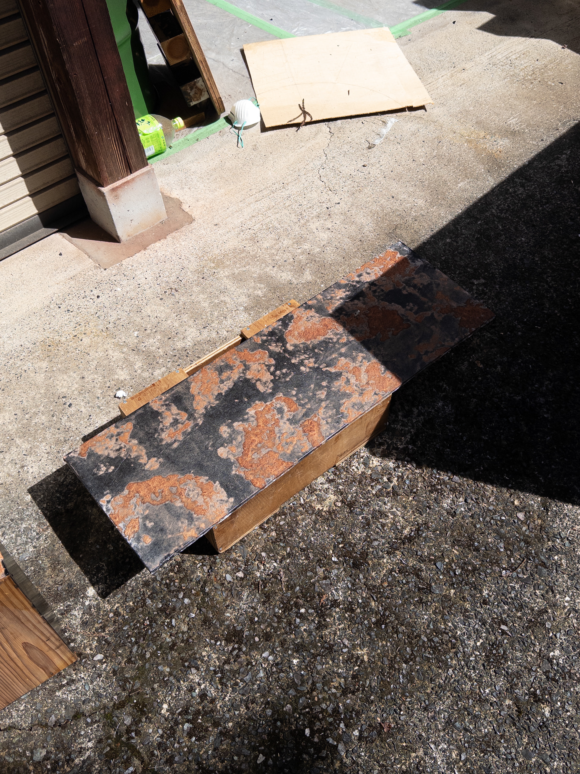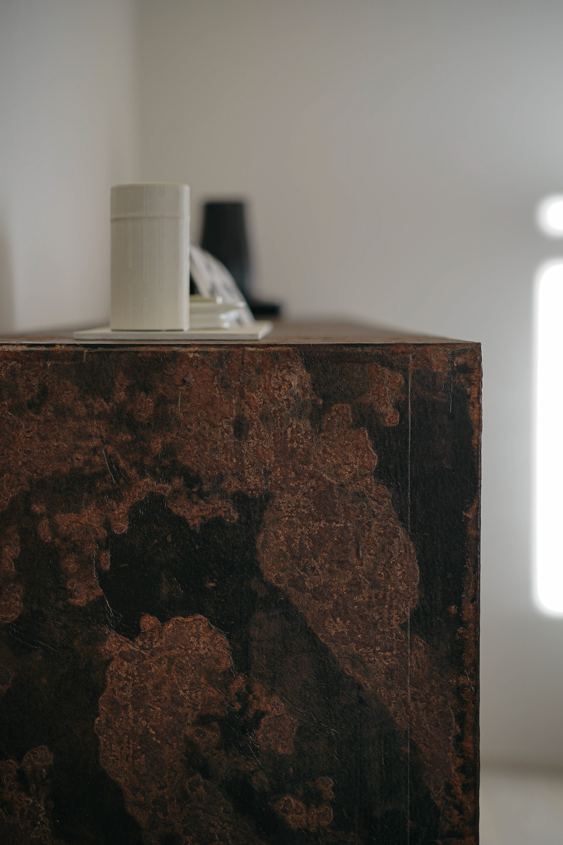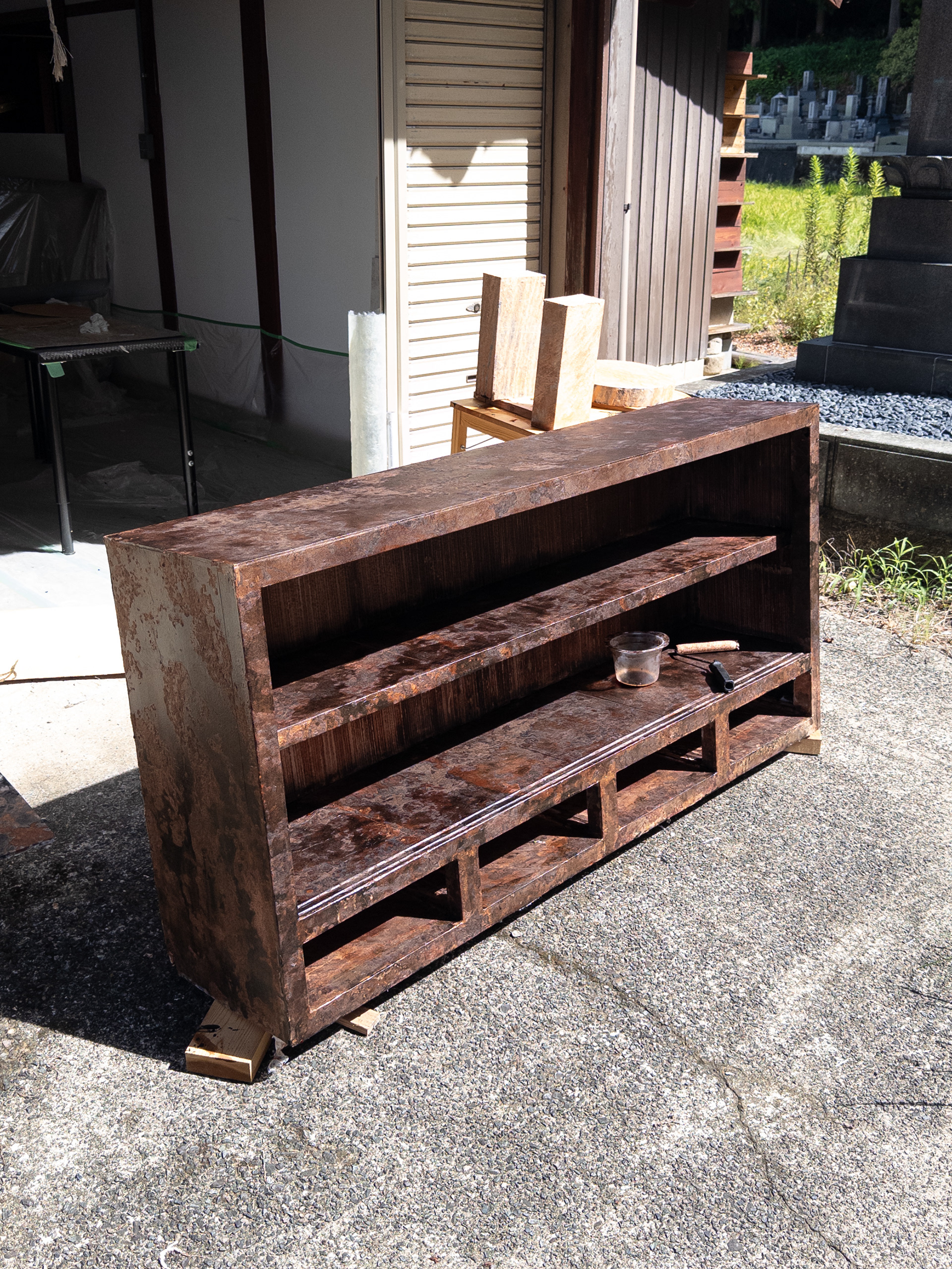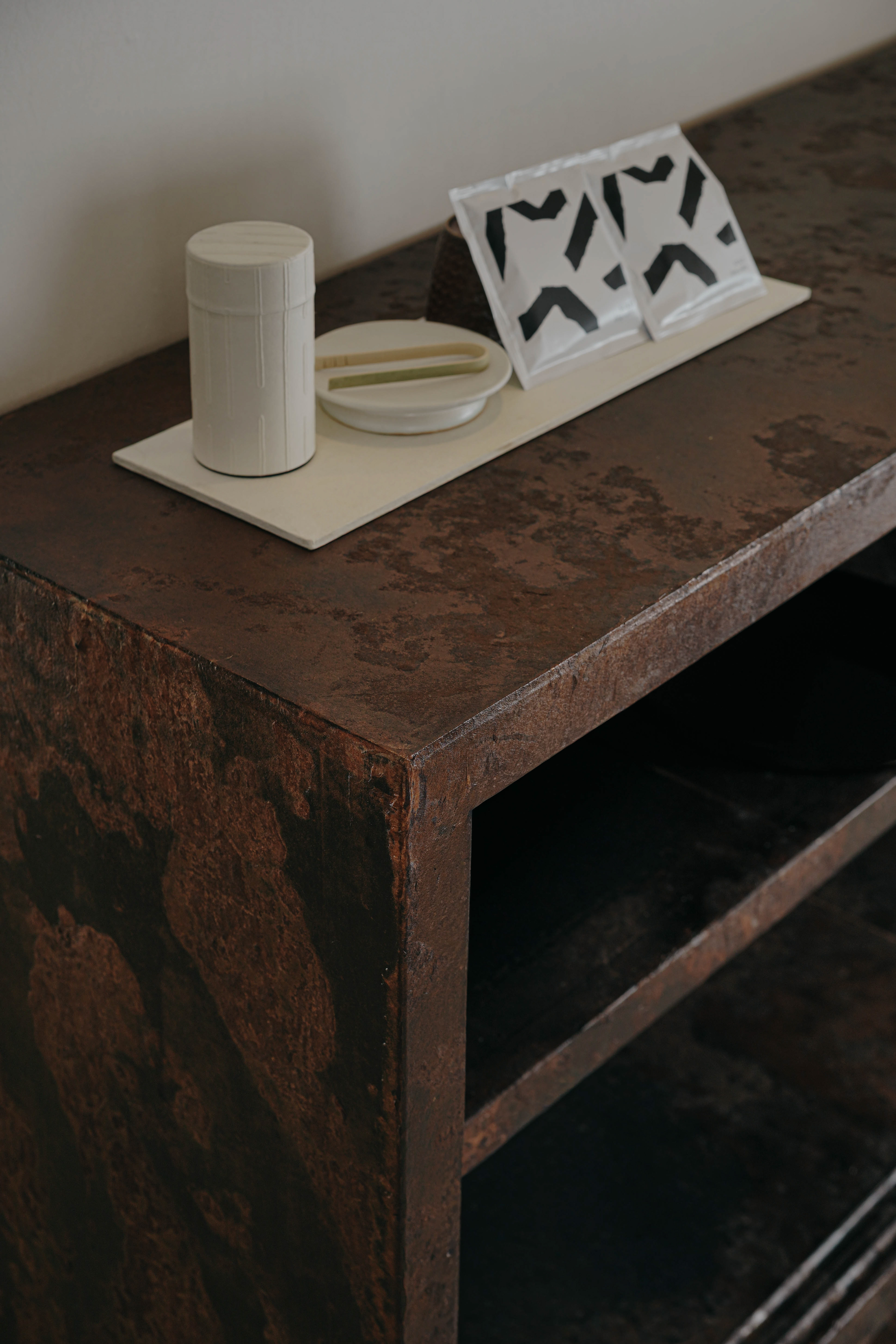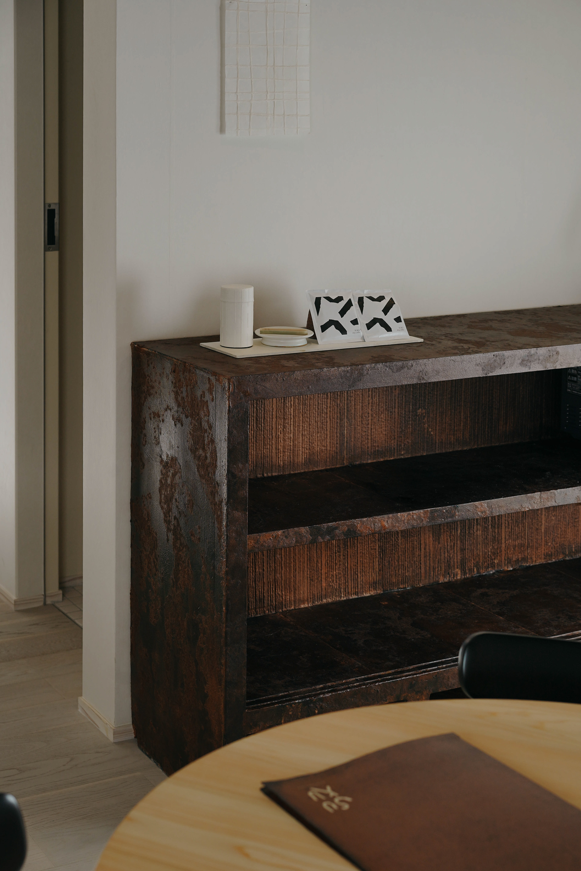 越前和紙を体感する工芸宿「SUKU」の客室「MIYSUMATA(三椏)」のために制作した箪笥。リノベーション前、この建物に残されていた古い箪笥に越前和紙を貼り、柿渋で仕上げることで新たな表情を与え甦らせました。色味の異なる柿渋を、粗密のある和紙に対して順に塗り重ねることで、複雑な表情を作り出しています。和紙に柿渋を施し耐久性を高めるという伝統的な技法を用いながら、時間の経過とともに錆びた鉄のような重厚な佇まいに仕上げました。 This tansu was created for the guest room “MIYSUMATA” at SUKU, a craft hotel where visitors can experience Echizen washi.An old, decaying tansu that had remained in the building before renovation was revived by covering it with Echizen washi and finishing it with layers of persimmon tannin, giving it a new expression. Different tones of persimmon tannin were applied one after another onto the uneven texture of the washi, allowing the absorption and coloration to occur intentionally at random. While using a traditional technique of strengthening washi by applying persimmon tannin, the piece was finished to develop, over time, a heavy presence reminiscent of rusted iron. Material : 越前和紙 Echizen washi(滝製紙所 @takiseishi ), 柿渋 persimmon tannin , 越前箪笥 Echizen tansu Design / Production : Rikuo Takata Client : SUKU Period : October 2025 Photo : Rikuo Takata