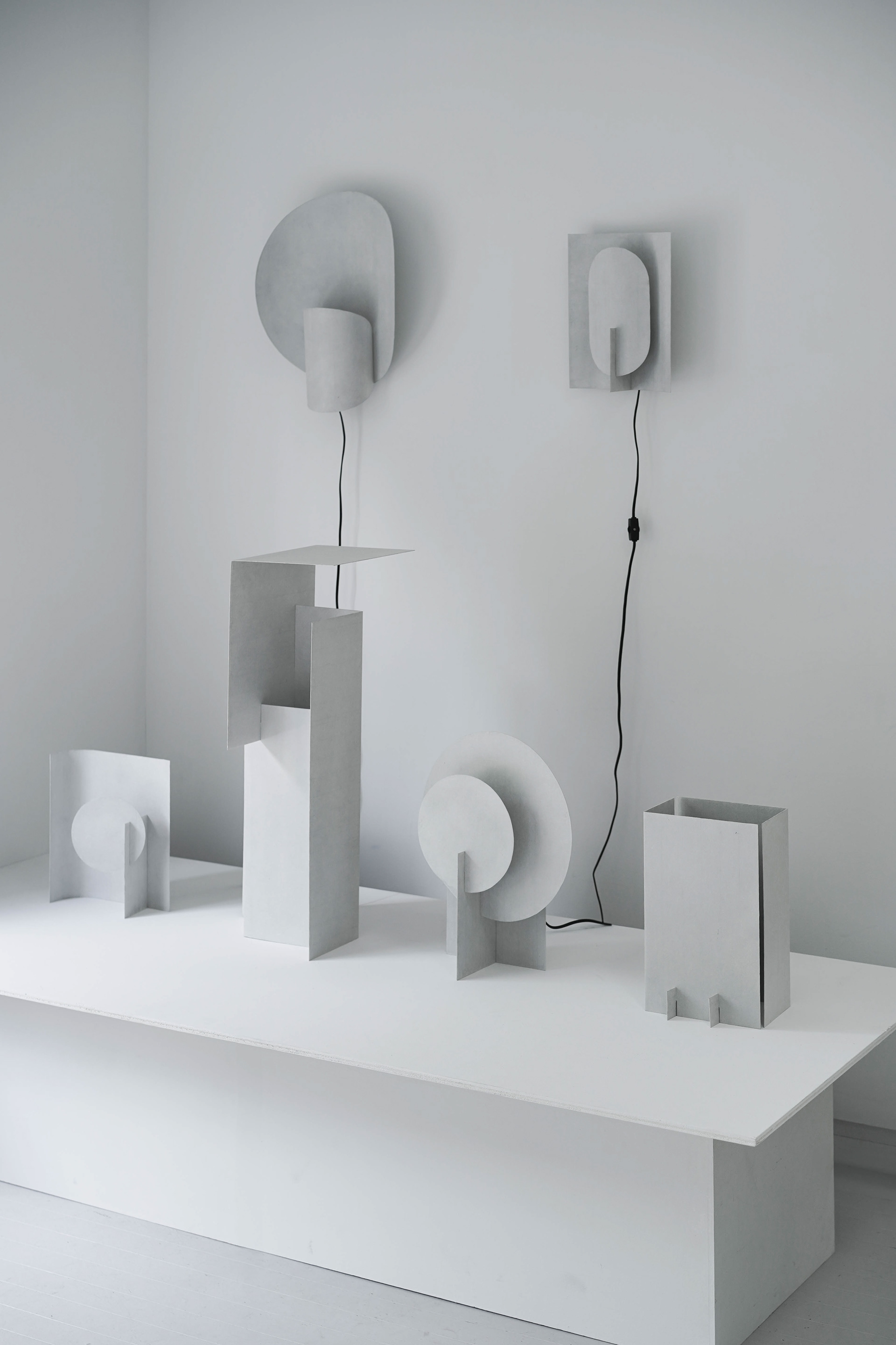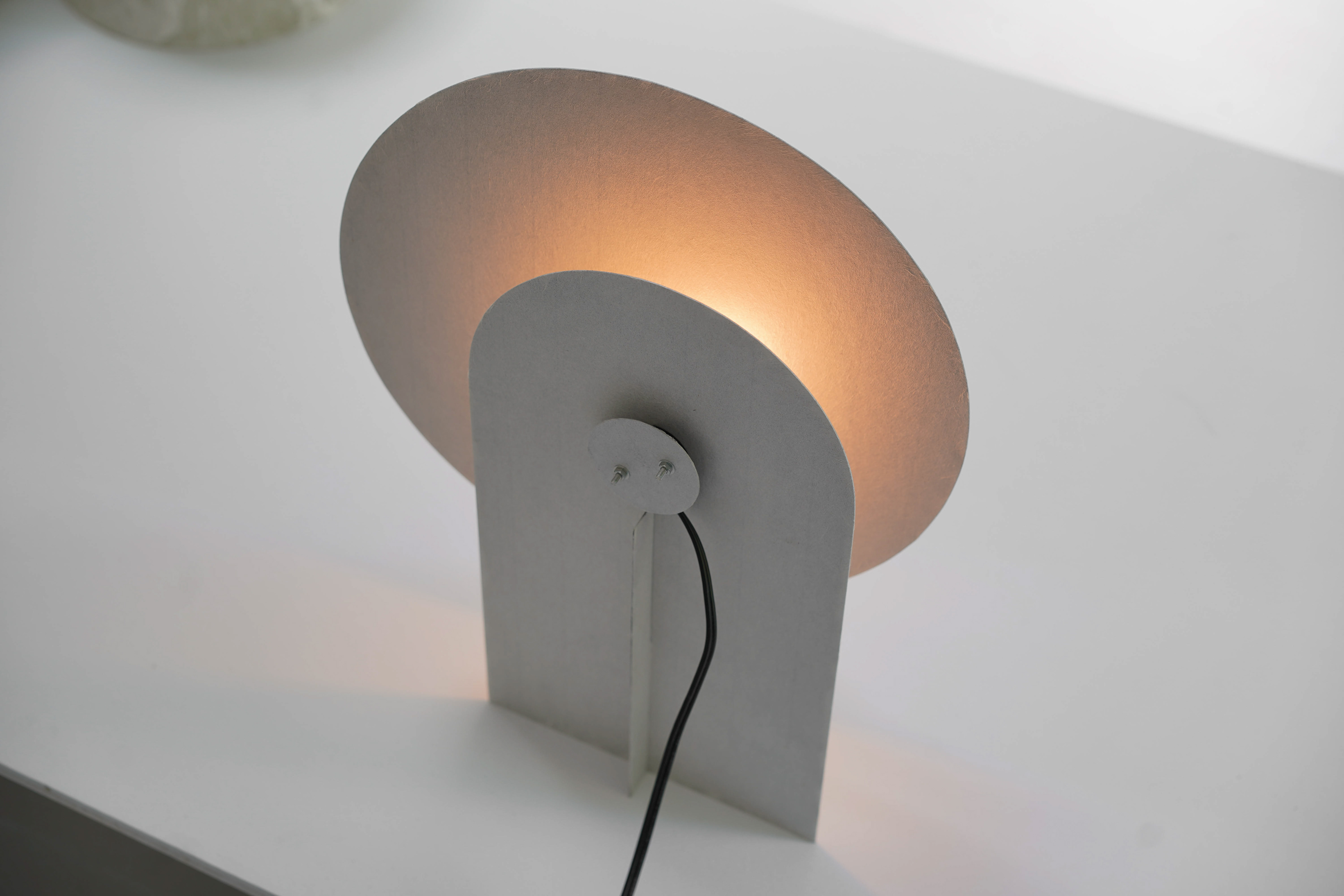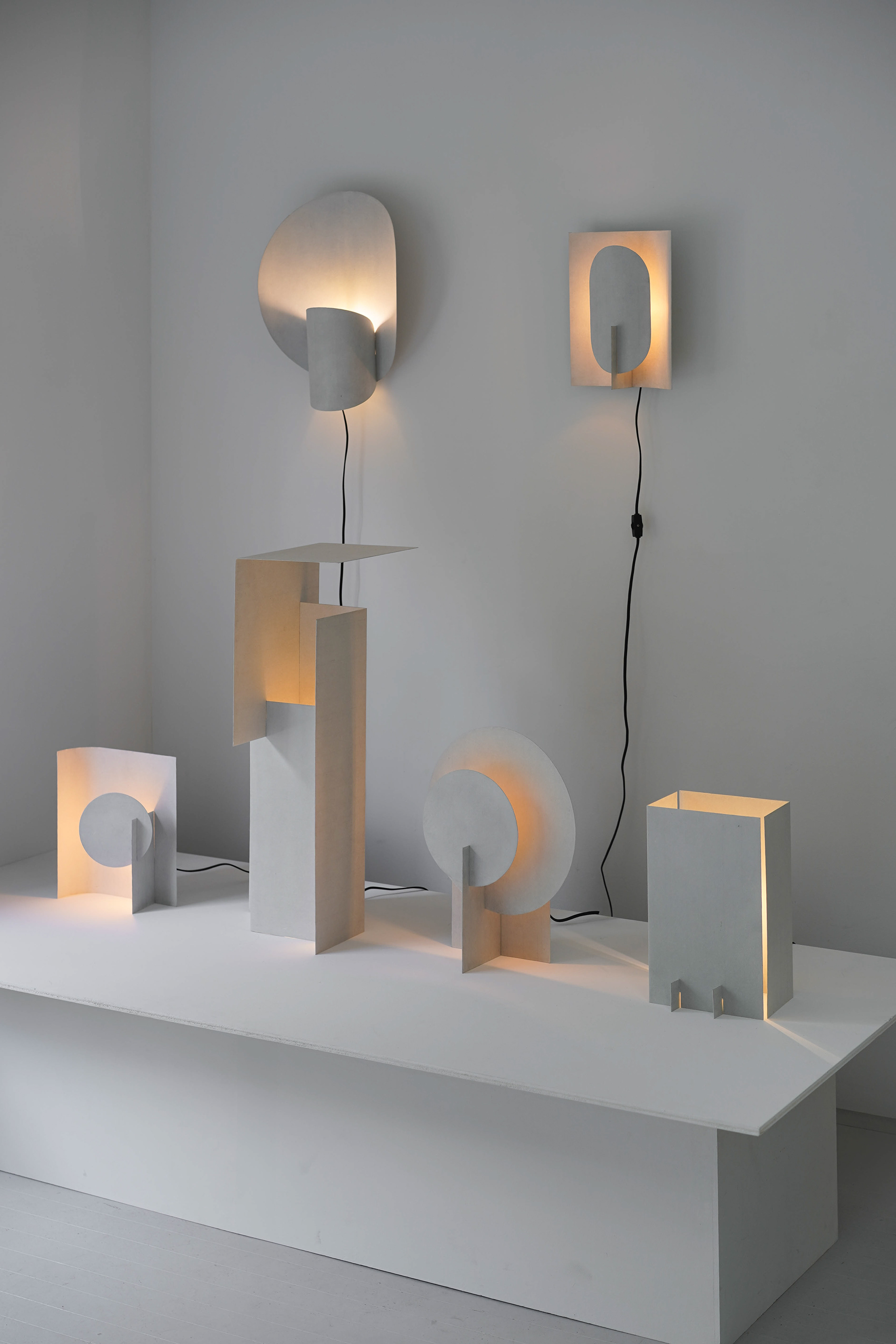Transflect シリーズは、極めて薄い和紙をアルミ板に貼り込むことで、和紙の柔らかな光の反射や透過性と、アルミの鈍い光沢や高い強度を両立させたプロダクトです。画用紙を鋏で切り抜き、ペーパークラフトのように組み合わせながら、形状を探り、生み出していきました。 The Transflect series is a collection of products created by laminating ultra thin washi paper onto aluminum plates. This unique combination achieves both the soft reflection and translucency of washi and the subdued sheen and high strength of aluminum. Each form was developed through an exploratory process cutting drawing paper with scissors and assembling it like papercraft to discover and refine the shapes. 和紙:卯立の工芸館