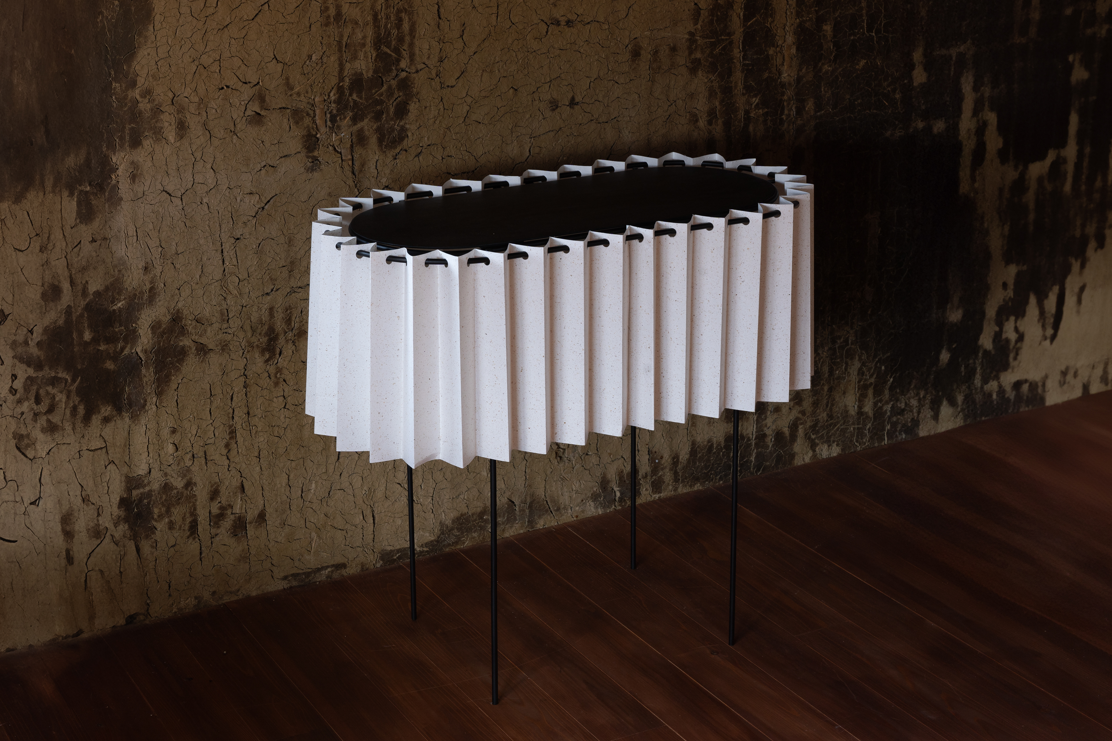 産地探査機1 号。折るという行為に焦点を当て、試行する中で紙の持つ柔軟性、弾力性を引き出すことができたと思う。 Production area explorer No. 1. Focusing on the act of folding, we believe we were able to bring out the flexibility and elasticity of paper through our trials. 和紙 : 清水紙工